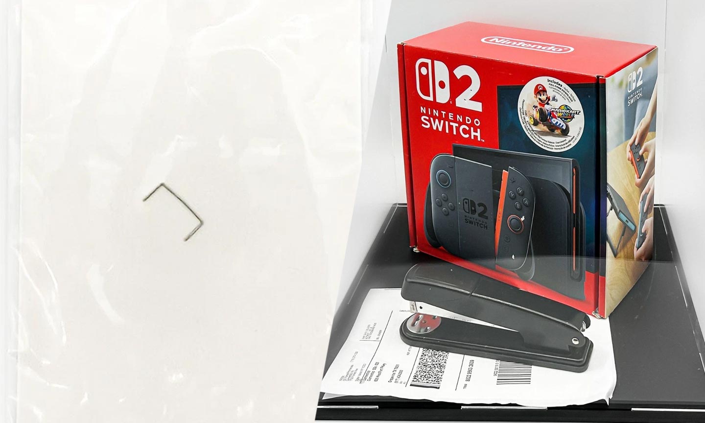 Im Auktionspaket enthalten ist auch die erste dokumentierte Switch 2, die davon betroffen war. Der Bildschirm wurde zwar ersetzt, doch die Verpackung trägt noch immer das Loch – inklusive der ursprünglichen Heftklammer, die ebenfalls beiliegt.