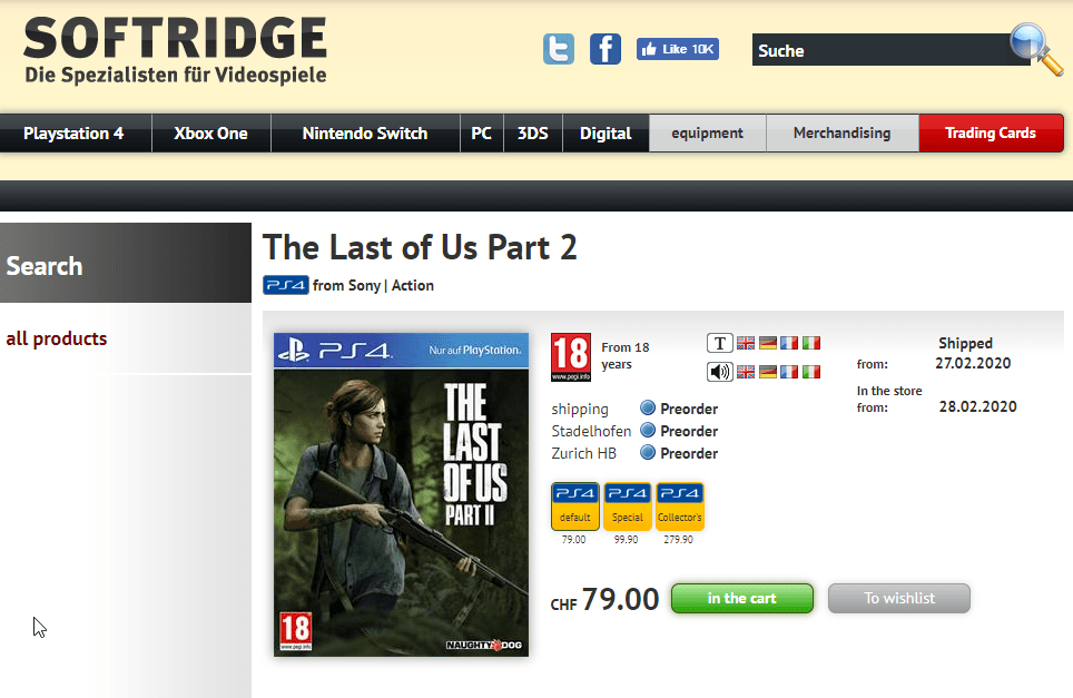 Der Schweizer Einzelhändler Softridge hat eine Liste für den mit Spannung erwarteten Naughty Dog-Titel erstellt und erwähnt, dass das Spiel am 28. Februar 2020 (via ResetEra) veröffentlicht wird. Die Auflistung enthält außerdem drei separate Ausgaben – eine Standardausgabe, eine Sonderausgabe und eine Sammlerausgabe – sowie jeweils eine Box-Art (auch wenn diese möglicherweise nicht endgültig ist), die man unterhalb der Meldung sehen kann. Es gibt auch einen Screenshot der unten aufgeführten Händlerliste, falls diese heruntergefahren werden sollte.