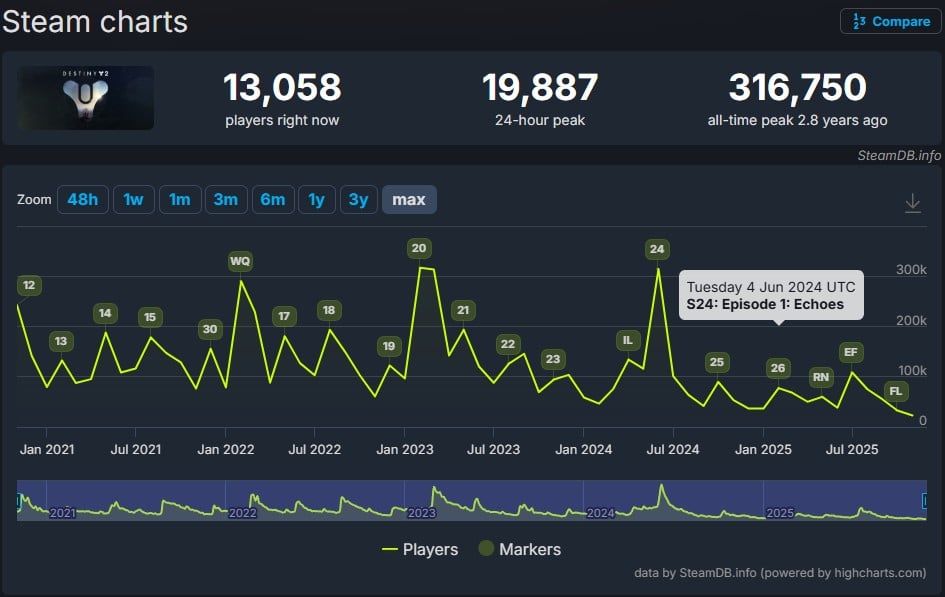 Destiny 2 kann die Steam-Spieler nicht halten. Seit den Auswertungen von SteamDB.info ist man seit 2021 am Tiefpunkt angelangt. – Bild: SteamDB.info