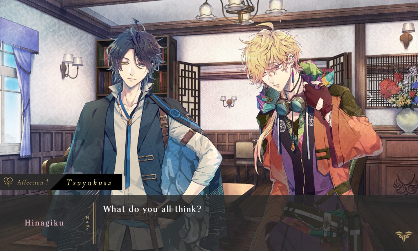 Natürlich darf eines in einem Otome-Game nicht fehlen – und zwar der Kindheitsfreund. Hier wäre das Tsuyukusa. Er ist der Besitzer des Ladens Hangetsudo, was heißt, er erledigt diverse Gelegenheitsjobs in der Stadt. Er ist eher ein introvertierter Nerd mit großem Interesse an Maschinen, die er selbst baut. Er ist unbeholfen und unsicher und erfüllt alle Erwartungen, die man an den typischen nerdigen Charakter hat, der dank der Konkurrenz beginnt, langsam aufzutauen.