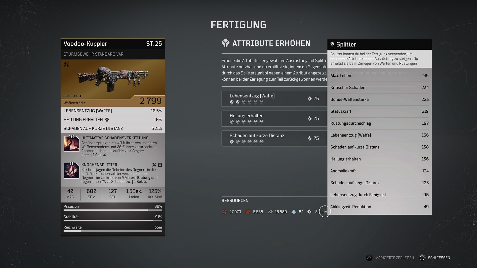 Durch das Zerlegen von Waffen bzw. Gegenständen erhält man auch Splitter. Diese sind aber in etliche Unterkategorien aufgeteilt. Mit Splittern kann man die einzelnen Attribute die eine Waffe oder ein Rüstungsteil hat, einzeln erhöhen. Sofern man von diesem Attribut auch einige Splitter besitzt. Das Splitter Inventar kann man sehen, wenn man den Cursor darüber bewegt.