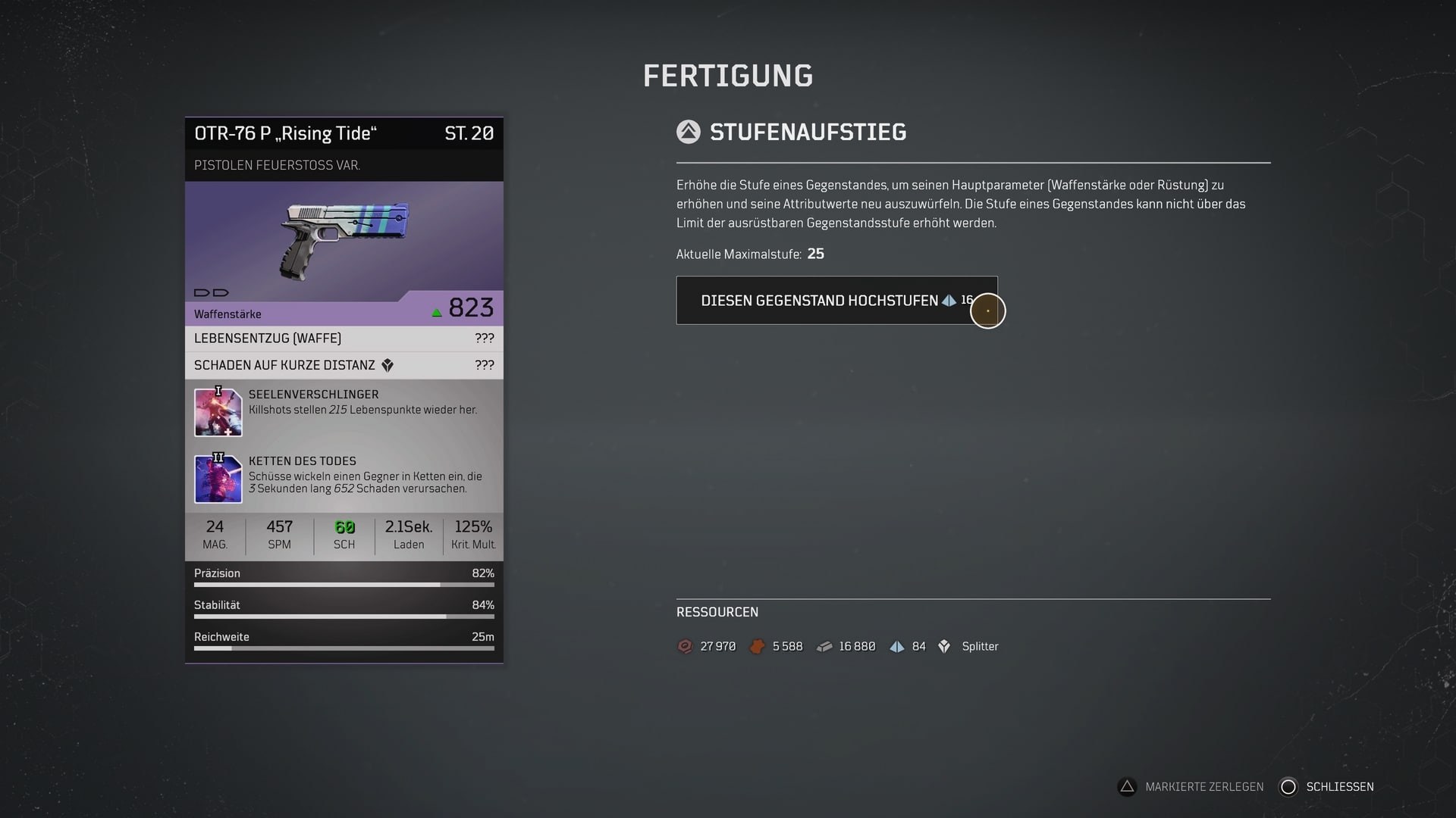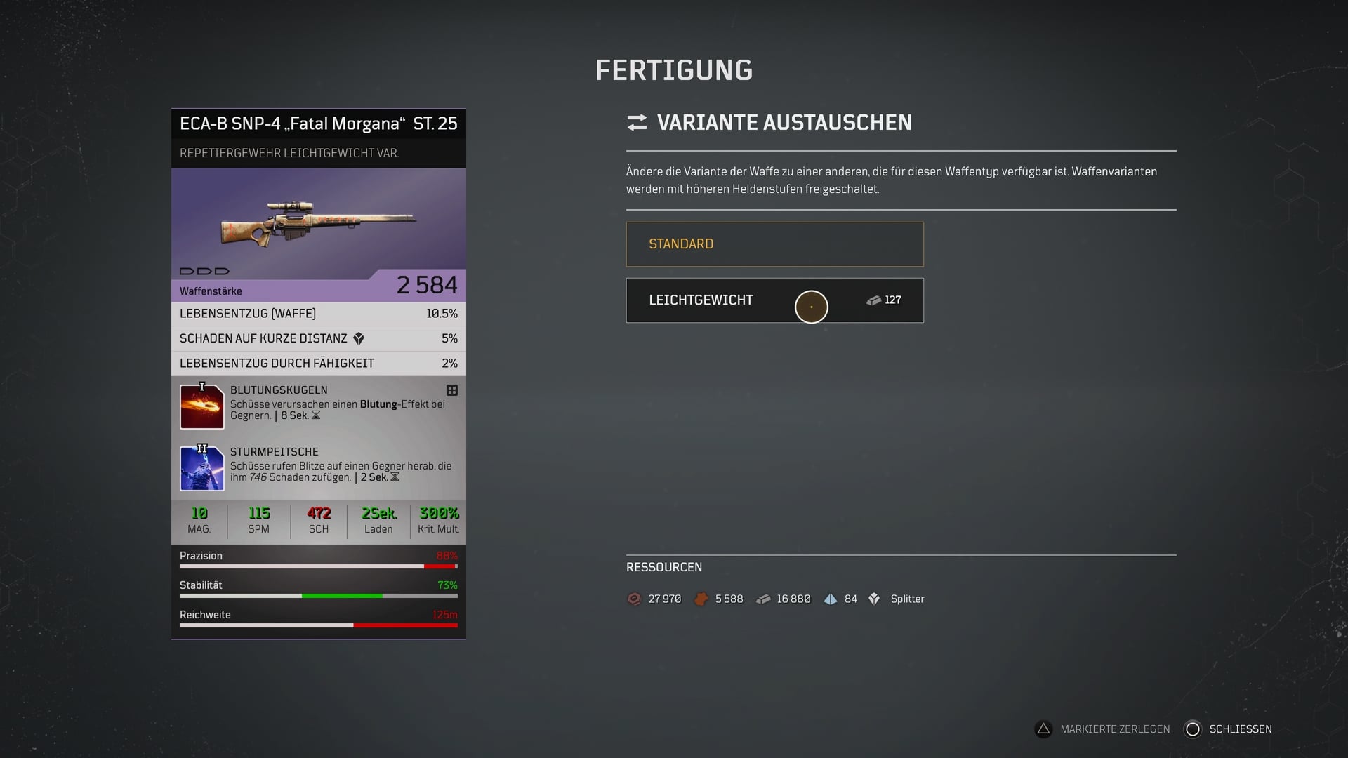 Das Crafting System in Outriders ist wirklich umfangreich und ich rate bei den Tipps sich auch selbst immer Gedanken zu machen. Passt die Veränderung die ich jetzt vornehmen werde auch zu meinem Spielstil. Oder auch, könnte ich diese Waffe meinem Spielstil besser anpassen wenn ich eine andere Variante wähle. Wie bei diesem Beispiel meines Scharfschützengewehrs.