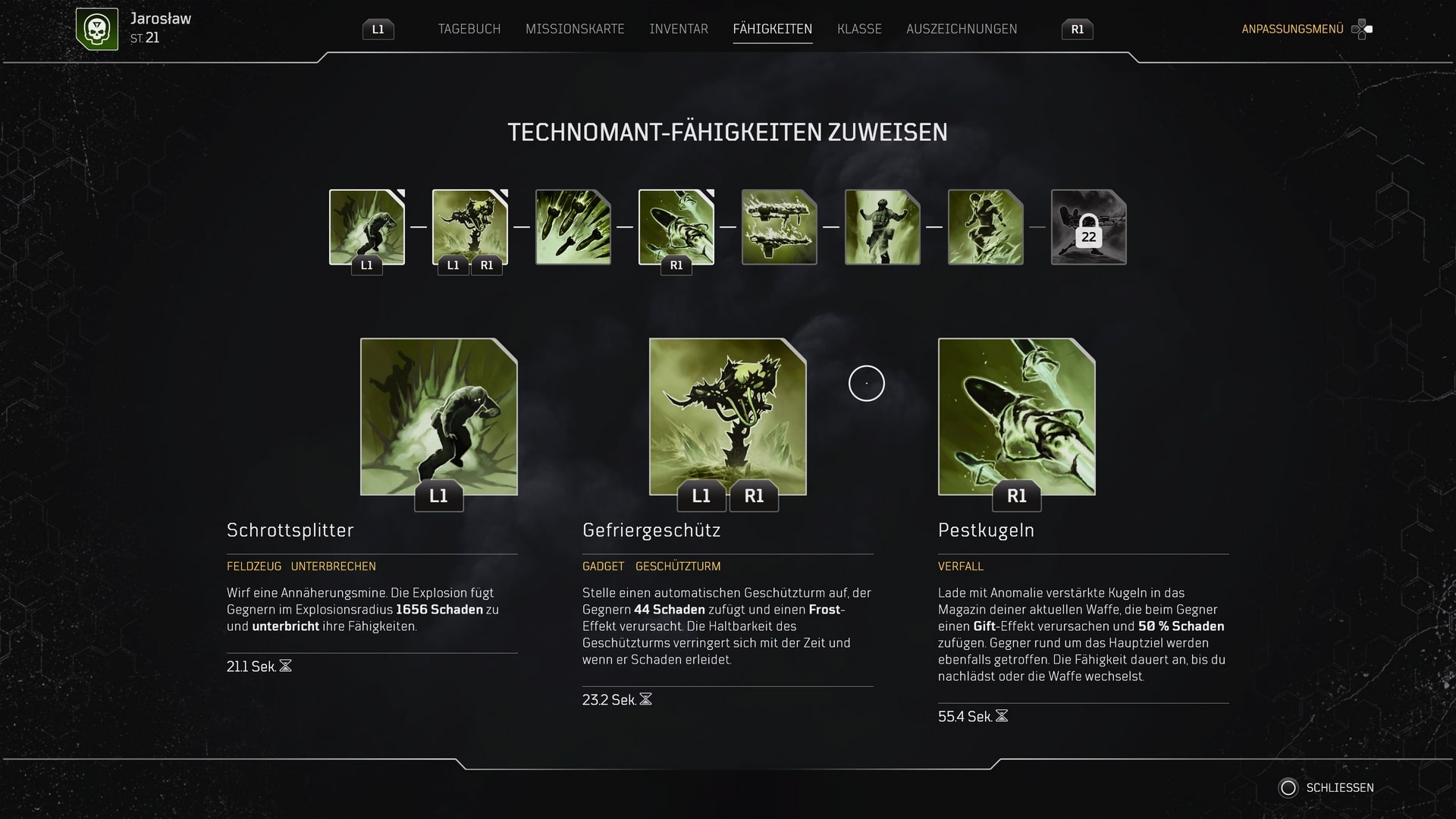 In Outriders gibt es vier unterschiedliche Klassen. Jede Klasse hat ihre spezifischen Fähigkeiten, welche sie durch die Anomalie erhalten haben. Diese Fähigkeiten sind absolut essenziell für die Schlachten. Hier gibt es ebenfalls offensive Fähigkeiten und defensive. In diesem Fall spiele ich einen eher auf Distanz kämpfenden Technomant und habe die Fähigkeiten so gewählt, dass Gegner mir nicht zu nahe kommen.